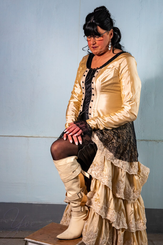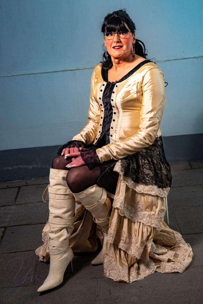 Der cremefarbene Stoff glänzt wie ein kleiner Auftritt für sich. Die schwarzen Spitzenakzente? Drama pur. Die Rüschen? Tanzen schon, bevor ich überhaupt losgehe. Und die Stiefel? Die sagen: „Ich bin nicht nur hier – ich meine das ernst.“
