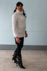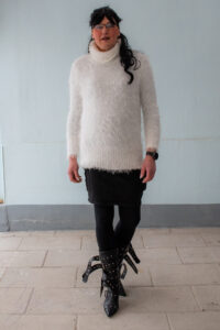 Zum Abschluss der treue Begleiter: flauschiger Pulli, Rock, Leggings, Boots.