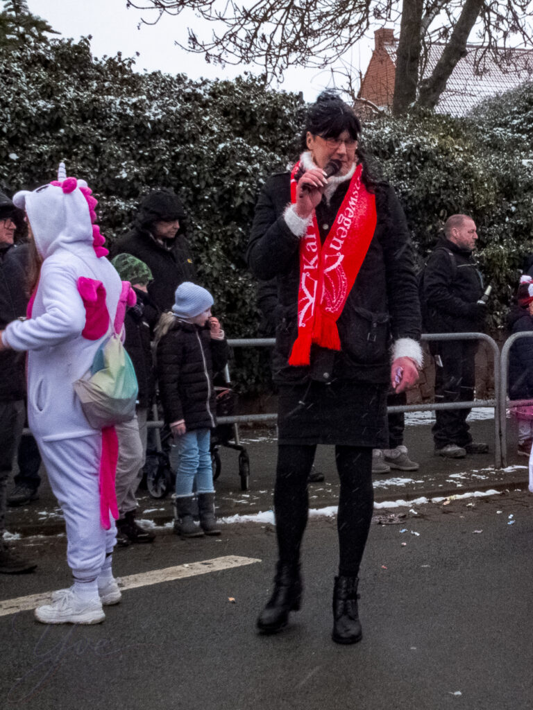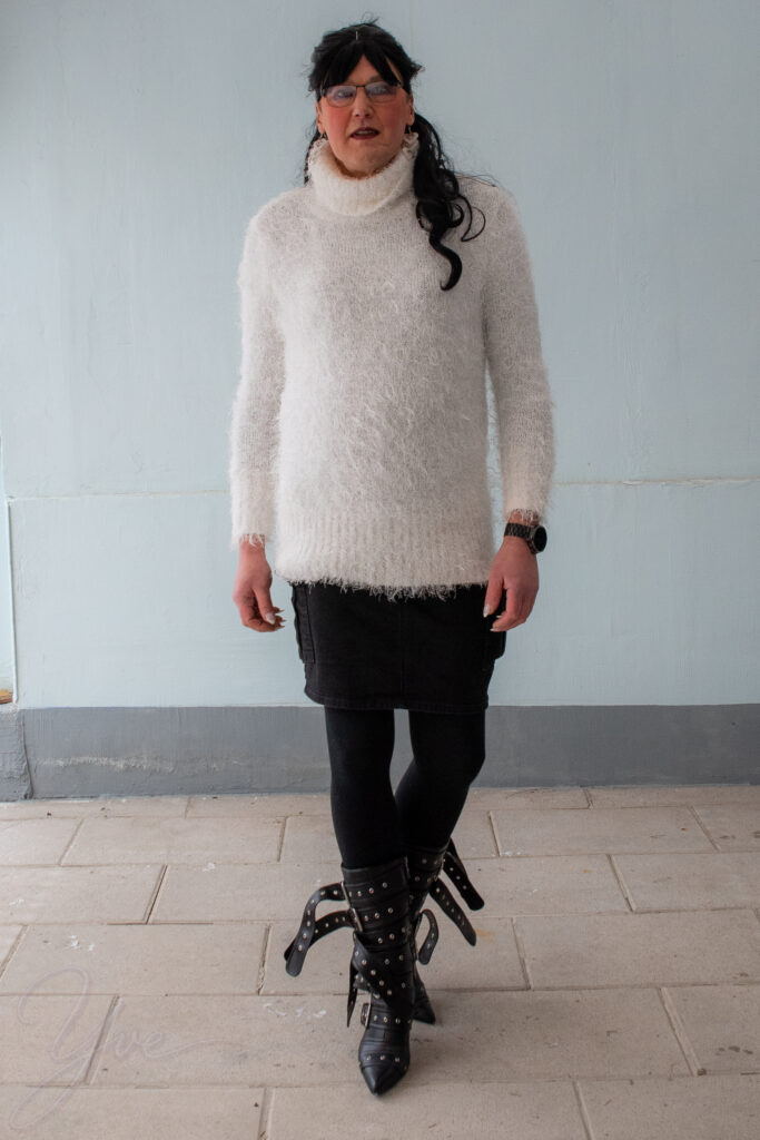 Der flauschige Rollkragen, der schwarze Rock, die Leggings – alles solide, alles warm, alles absolut Rosenmontag‑tauglich. Die Boots bringen wenigstens ein bisschen Rock rein, aber seien wir ehrlich: Das ist kein BÄHM. Das ist ein „Ich überlebe die Glätte und falle nicht hin“-Look.