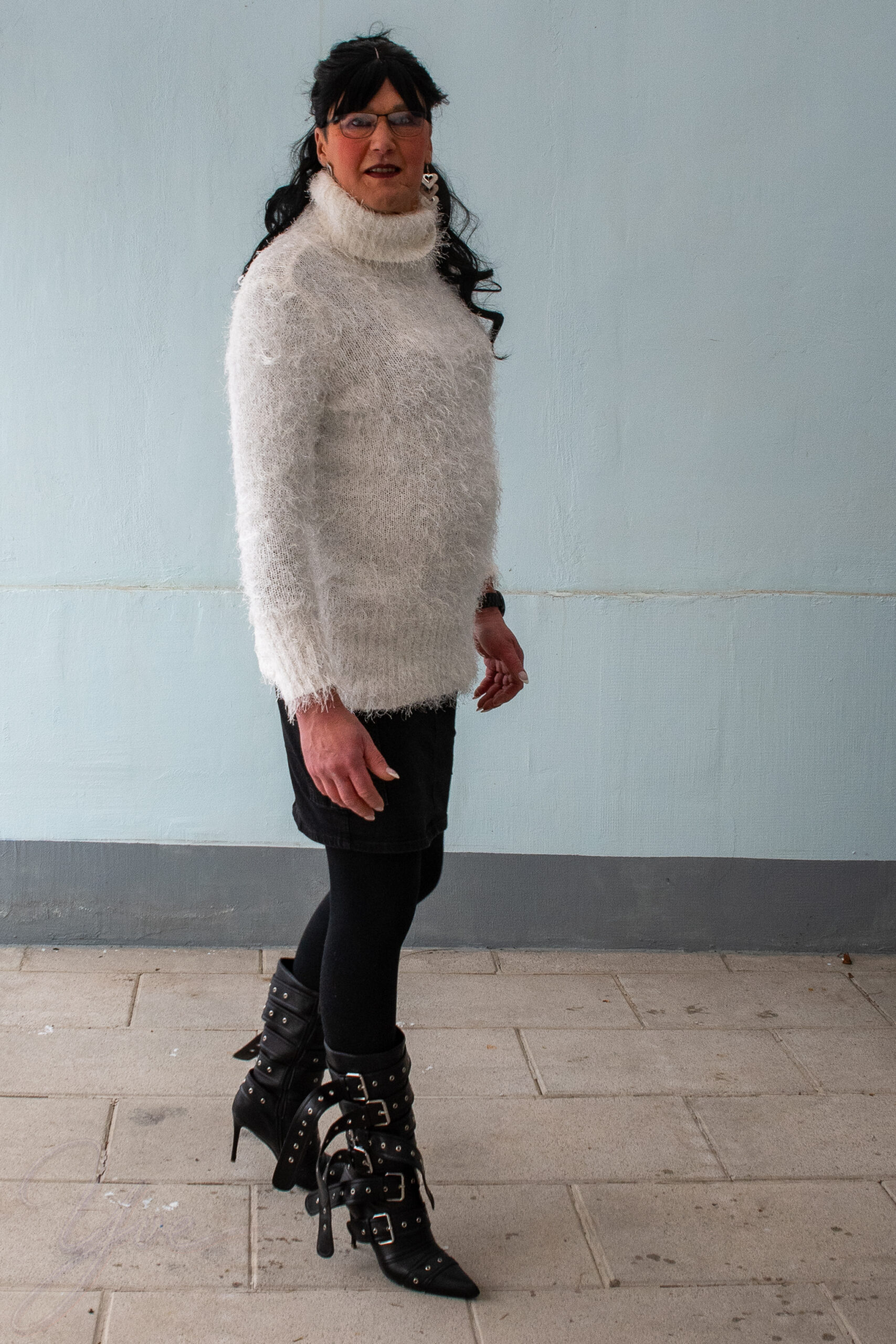Der flauschige Rollkragen, der schwarze Rock, die Leggings – alles solide, alles warm, alles absolut Rosenmontag‑tauglich. Die Boots bringen wenigstens ein bisschen Rock rein, aber seien wir ehrlich: Das ist kein BÄHM. Das ist ein „Ich überlebe die Glätte und falle nicht hin“-Look.